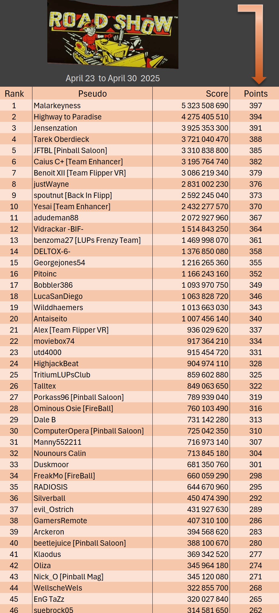 Classical TournamentResultsPodiumoverall team rankingLeaderboardWomen's rankingTeam points detailsTrophiesTournements Season 1TournamentsSaison 2Saison 1Saison 0LeaderboardsSaison 2Saison 1Saison 0EventsSummer Pinball Fest 2025Fan Layout CityThe Pinball...