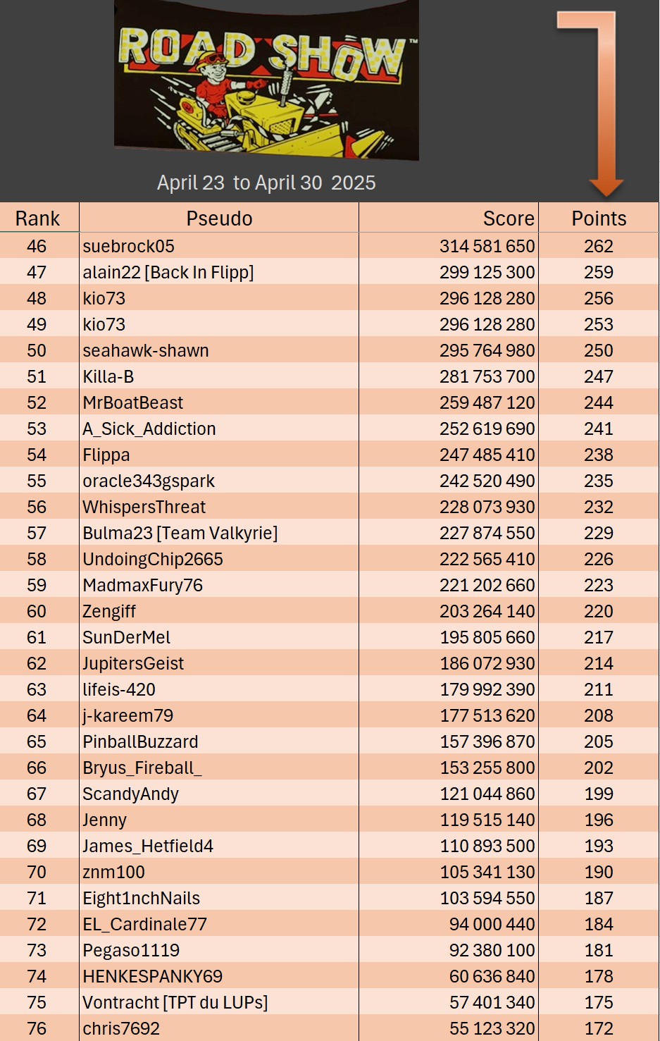 Mode Pro TournamentResultsoverall team rankingPodiumResultsLeaderboardWomen's rankingTeam points detailsTrophiesTournements Season 1TournoisMusiqueFractalesA proposSoutienThe Pinball SaloonDiscordFacebookSite webBluesky The Pinball SaloonCommunautéNo Man's SkyMass...