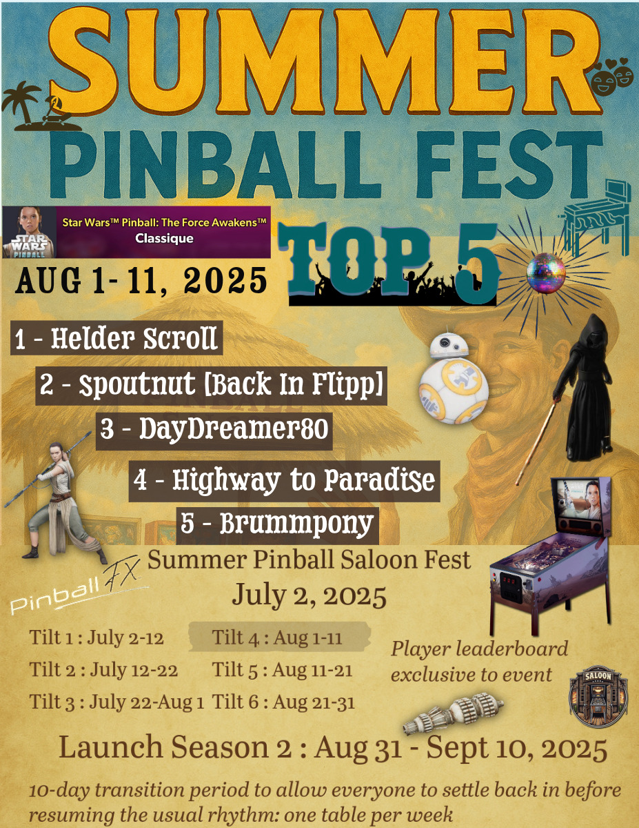 Classical TournamentID #Vxl6nr3xy6 Pinball FXTop 5Full table result (click on images to enlarge)Tournements Summer Pinball Fest 2025TournamentsSaison 2Saison 1Saison 0LeaderboardsSaison 2Saison 1Saison 0EventsSummer Pinball Fest 2025Fan Layout CityThe Pinball...