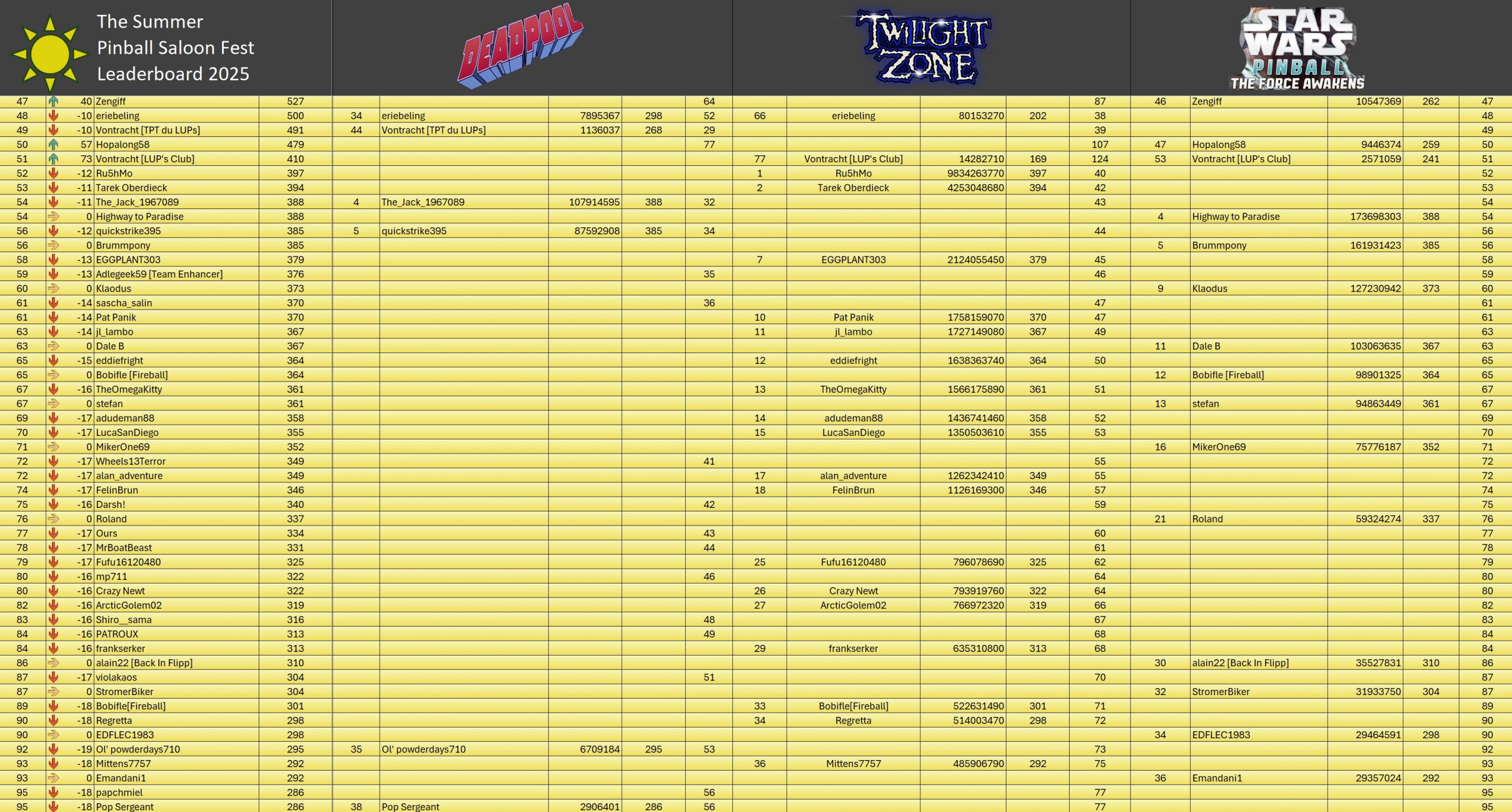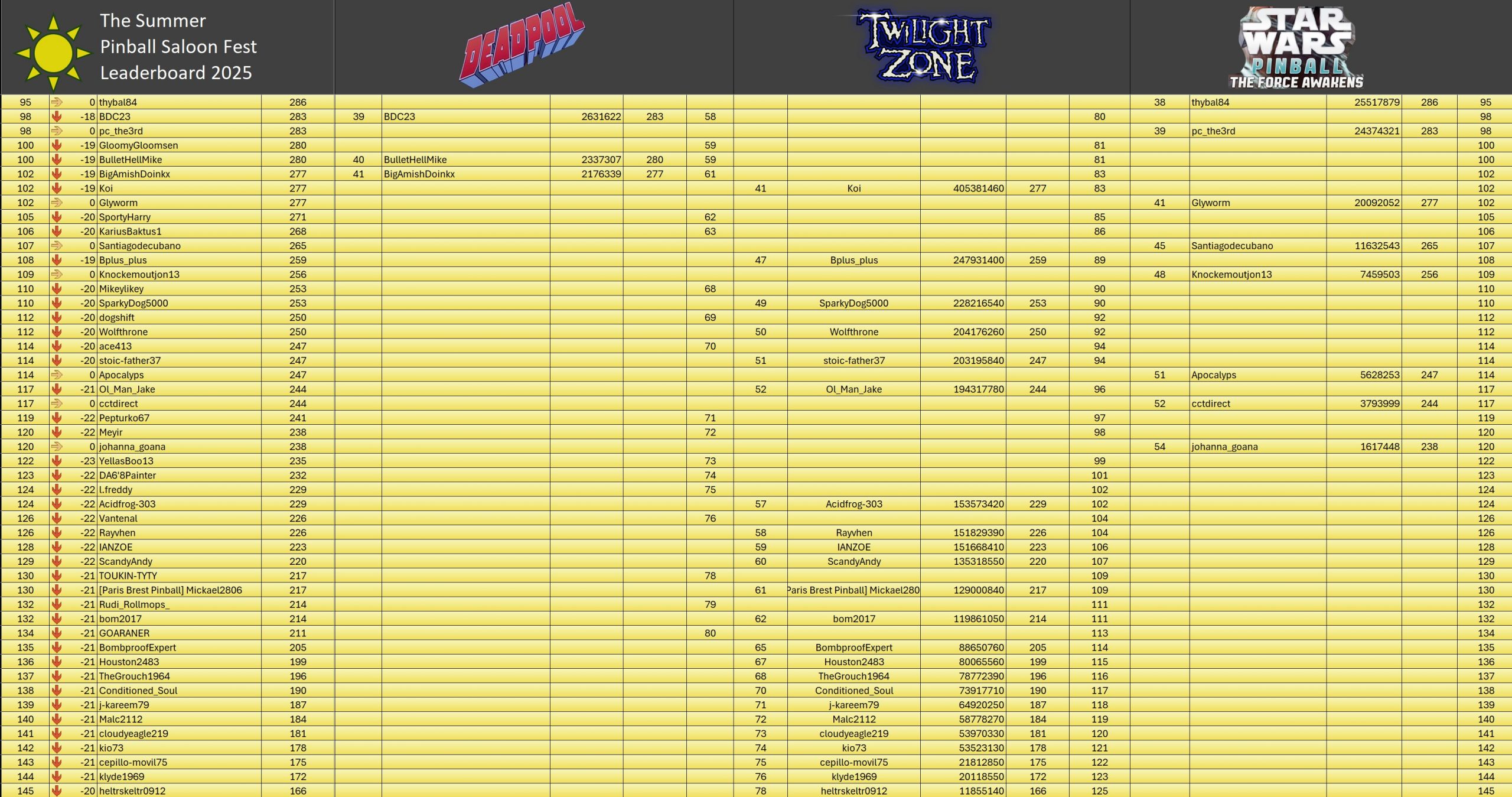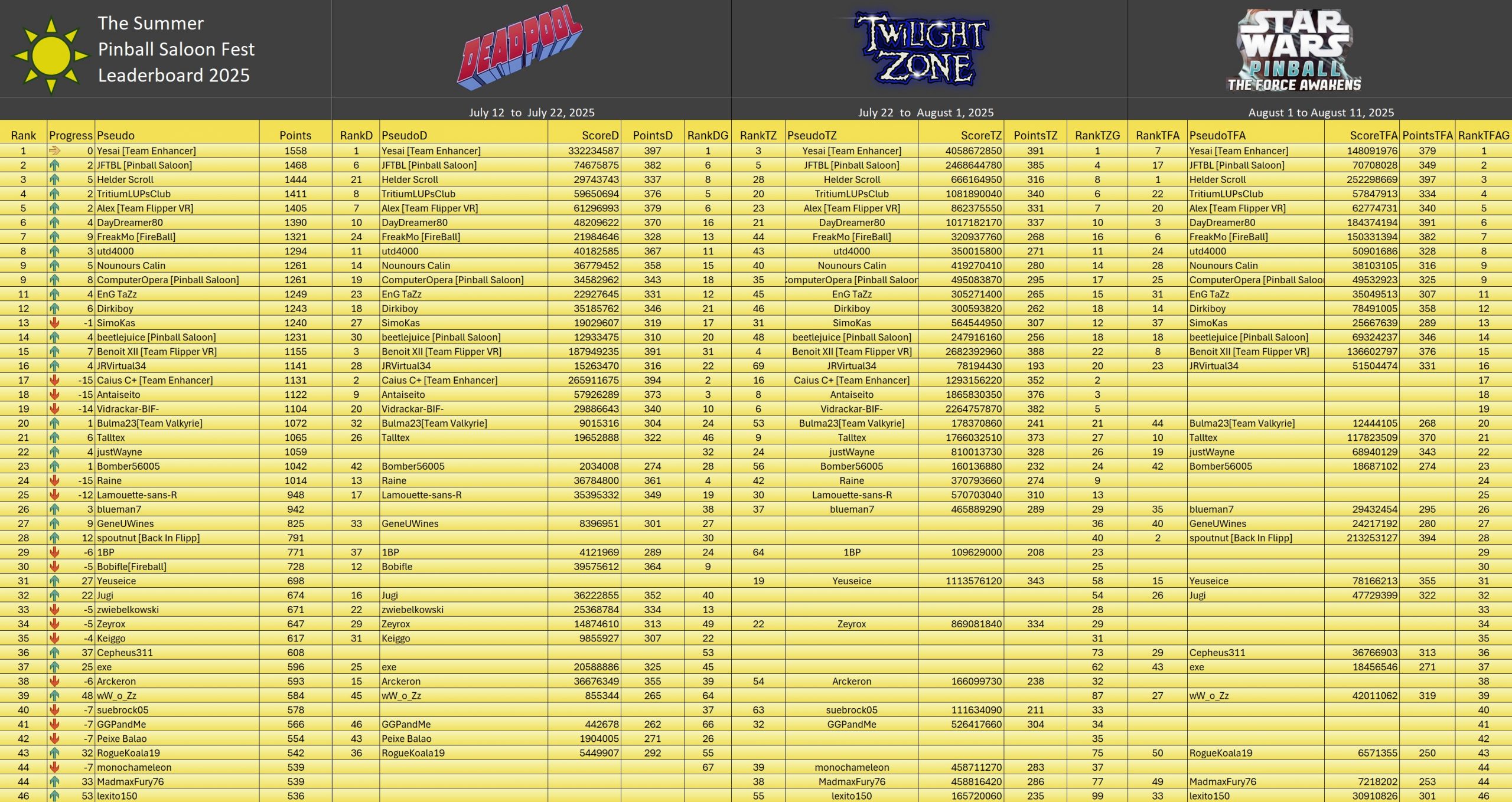Classic TournamentID #Fnd26e2qy9   Pinball FXTop 5Resultsgeneral ranking (Click on the images to enlarge them)Summer Pinball Fest 2025TournamentsSaison 2Saison 1Saison 0LeaderboardsSaison 2Saison 1Saison 0EventsSummer Pinball Fest 2025Fan Layout CityThe Pinball...