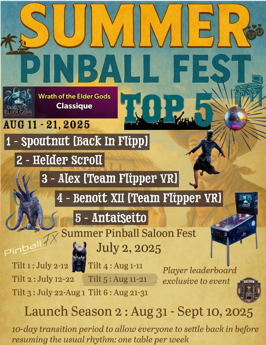 Classical TournamentID #Vxl6nr3xy6 Pinball FXTop 5ResultsExtract from the general ranking (Click to enlarge)Tournements Summer Pinball Fest 2025TournamentsSaison 2Saison 1Saison 0LeaderboardsSaison 2Saison 1Saison 0EventsSummer Pinball Fest 2025Fan Layout CityThe...