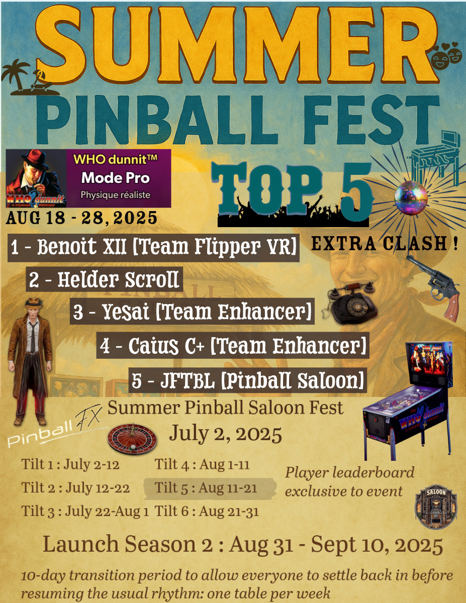Classic TournamentID #Fnd26e2qy9 Pinball FXTop 5Resultsgeneral ranking (Click on the images to enlarge them)Summer Pinball Fest 2025TournamentsSaison 2Saison 1Saison 0LeaderboardsSaison 2Saison 1Saison 0EventsSummer Pinball Fest 2025Fan Layout CityThe Pinball...