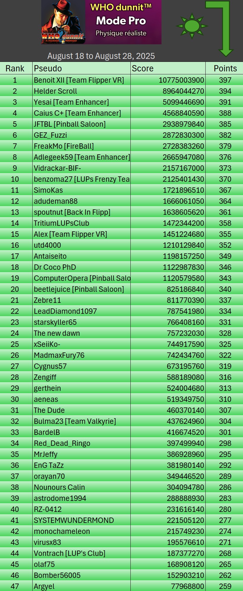 Classical TournamentID #Vxl6nr3xy6 Pinball FXTop 5Full table result (click on images to enlarge)Tournements Summer Pinball Fest 2025TournamentsSaison 2Saison 1Saison 0LeaderboardsSaison 2Saison 1Saison 0EventsSummer Pinball Fest 2025Fan Layout CityThe Pinball...