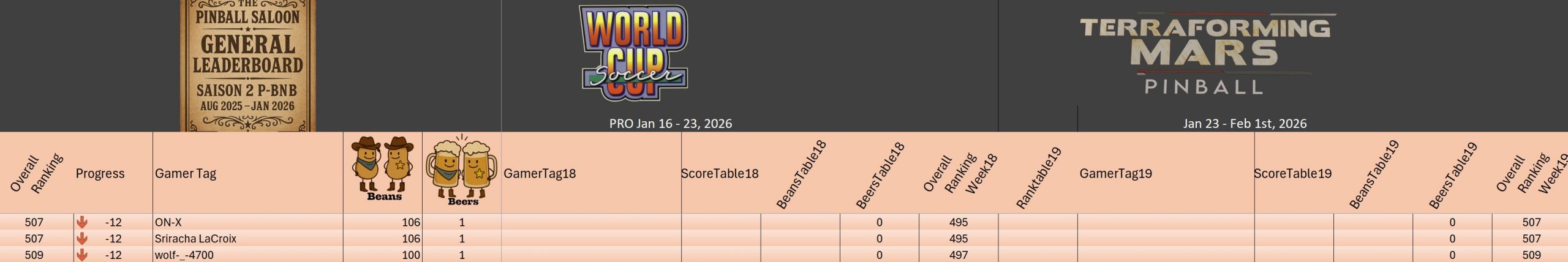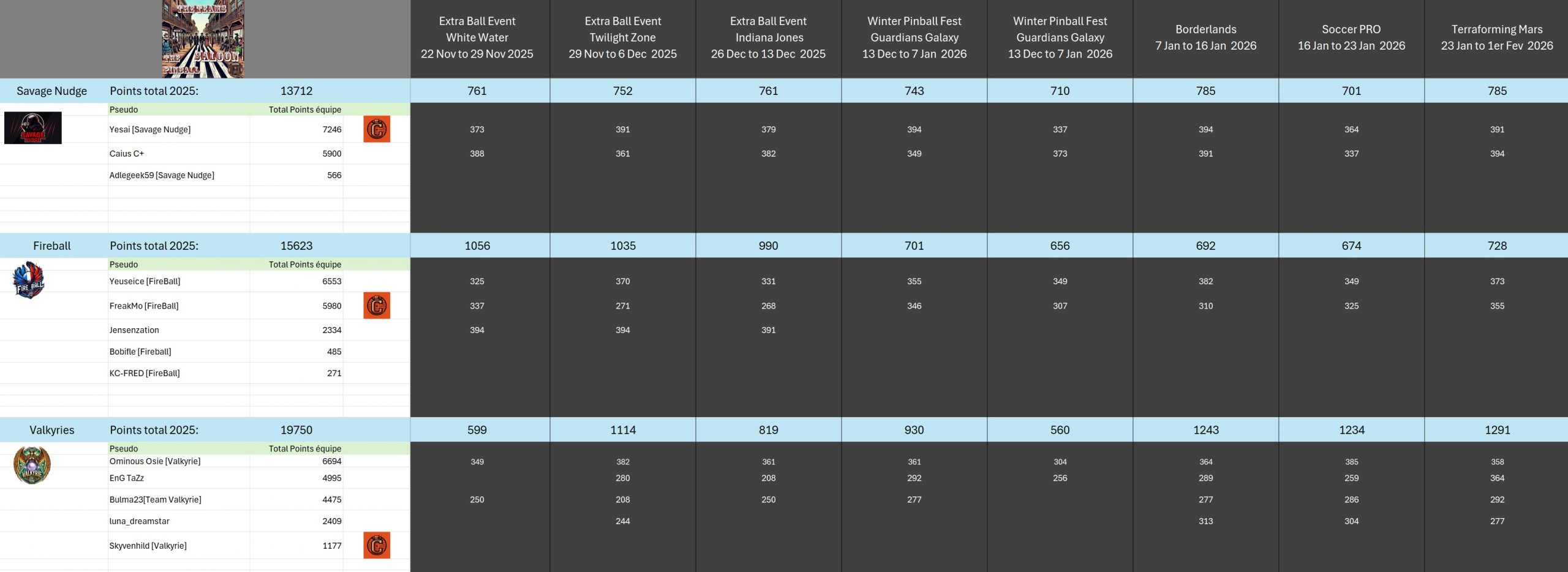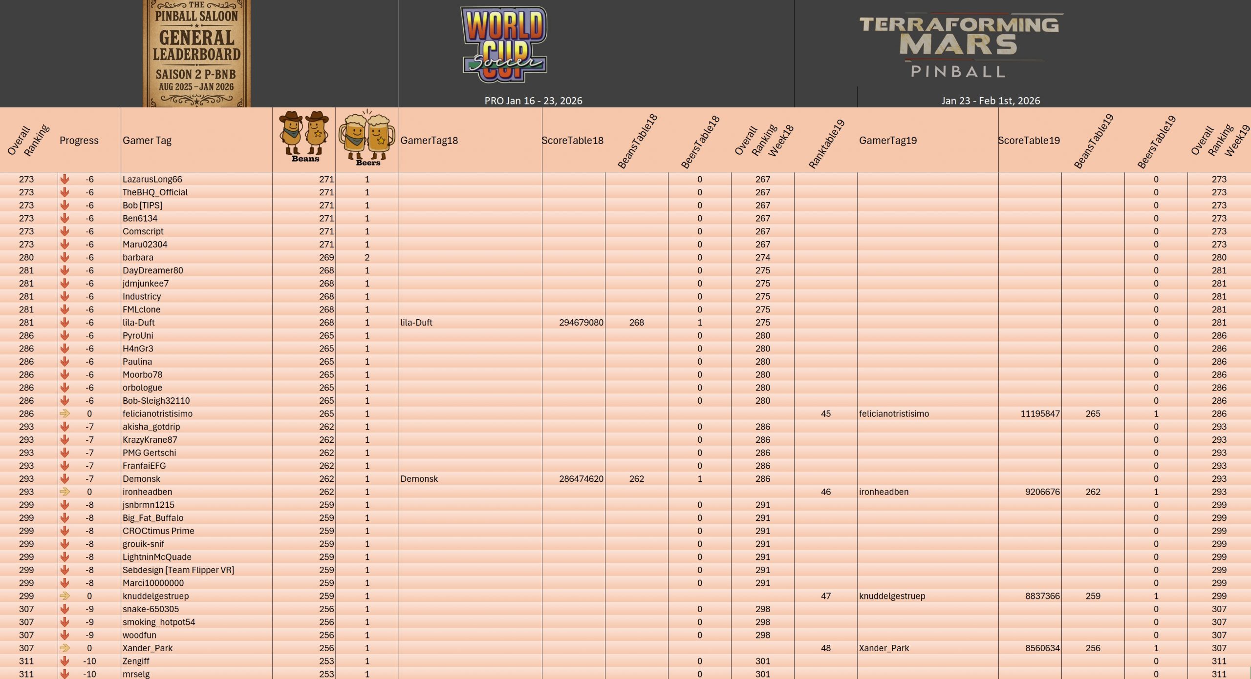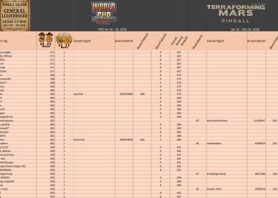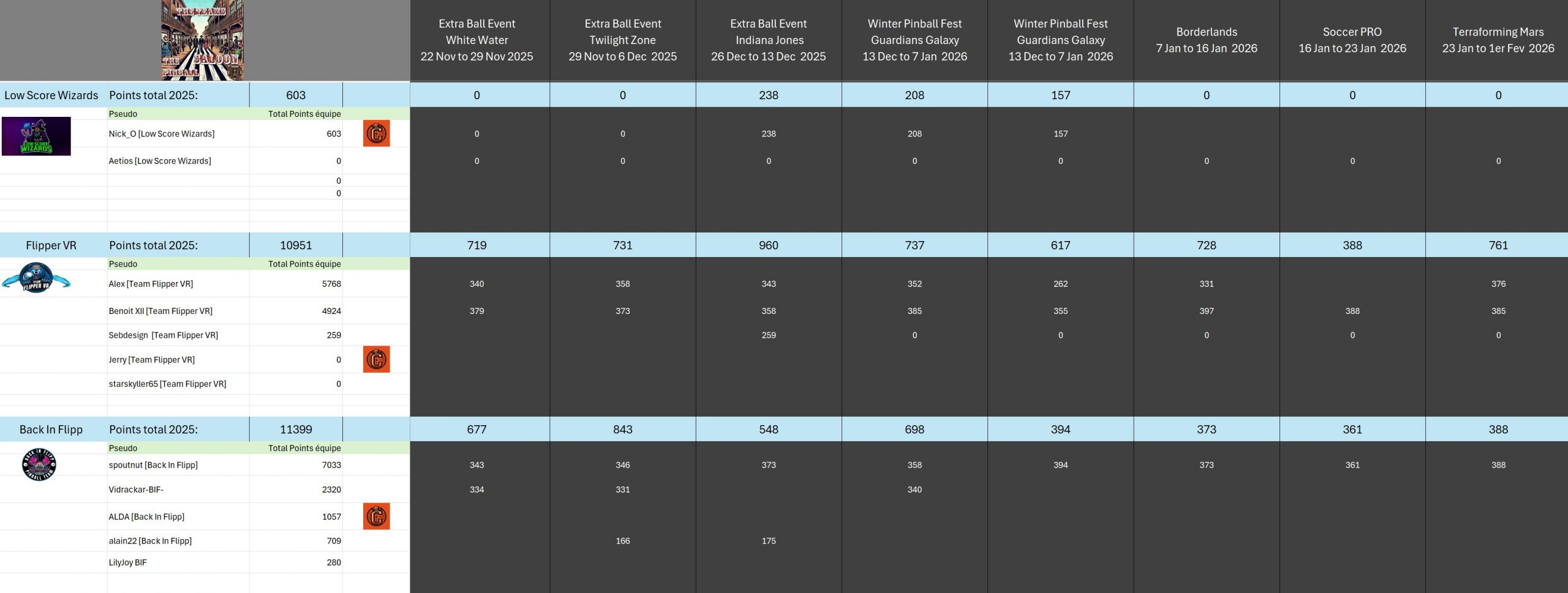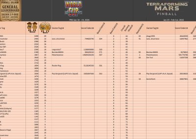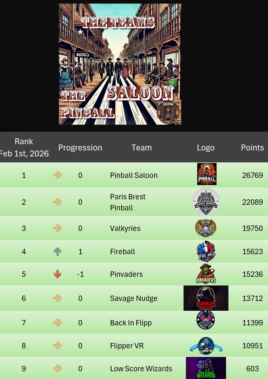 PRO TournamentID #Xwj16g33ol Pinball FXTop 5Result TournamentExtract from the general rankingWomen's rankingTeam's rankingPistoleros's rankingSeason 2 P-BnB Sept 2025 - Jan 2026TournamentsSaison 2Saison 1Saison 0LeaderboardsSaison 2Saison 1Saison 0EventsSummer...