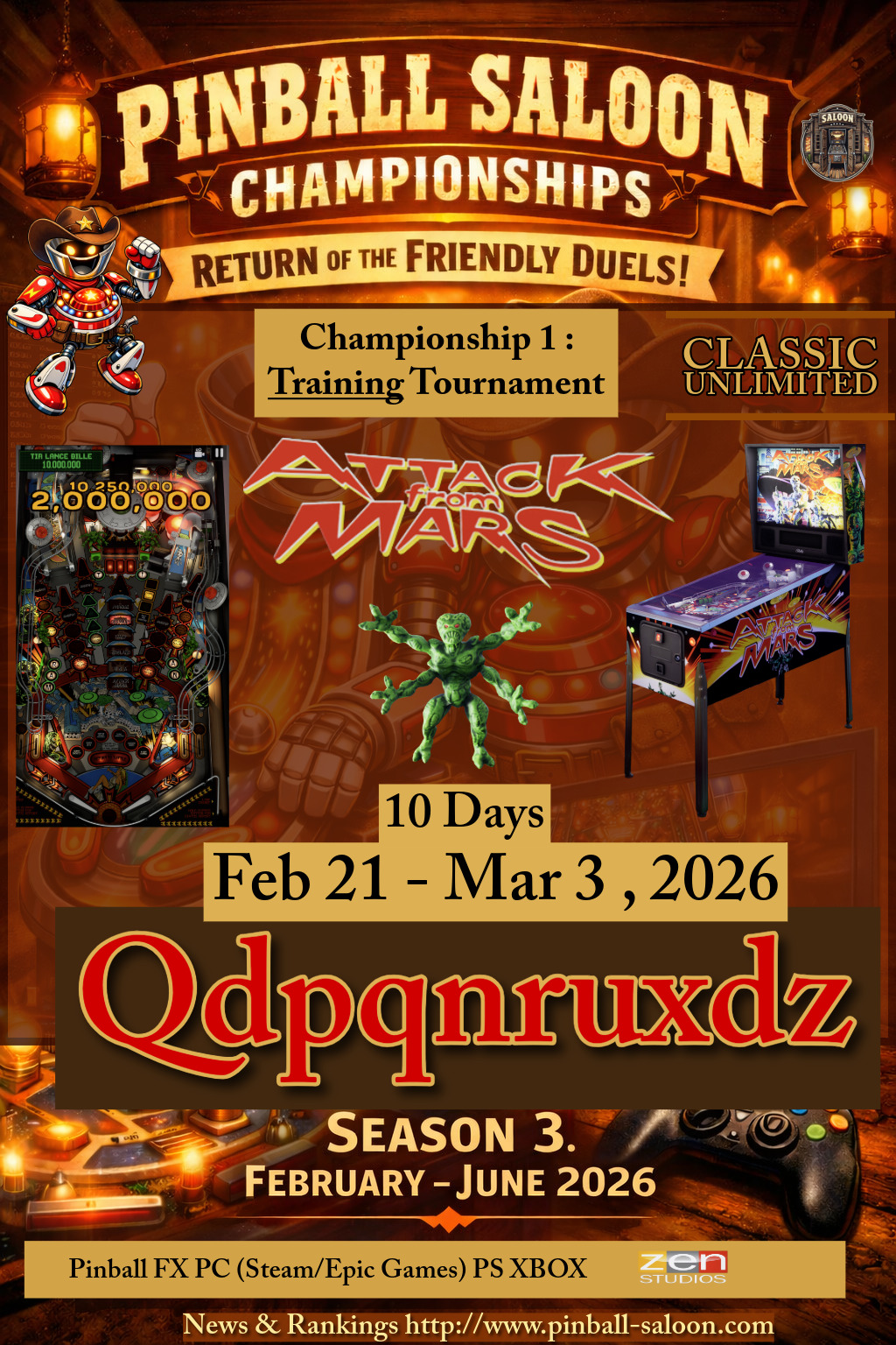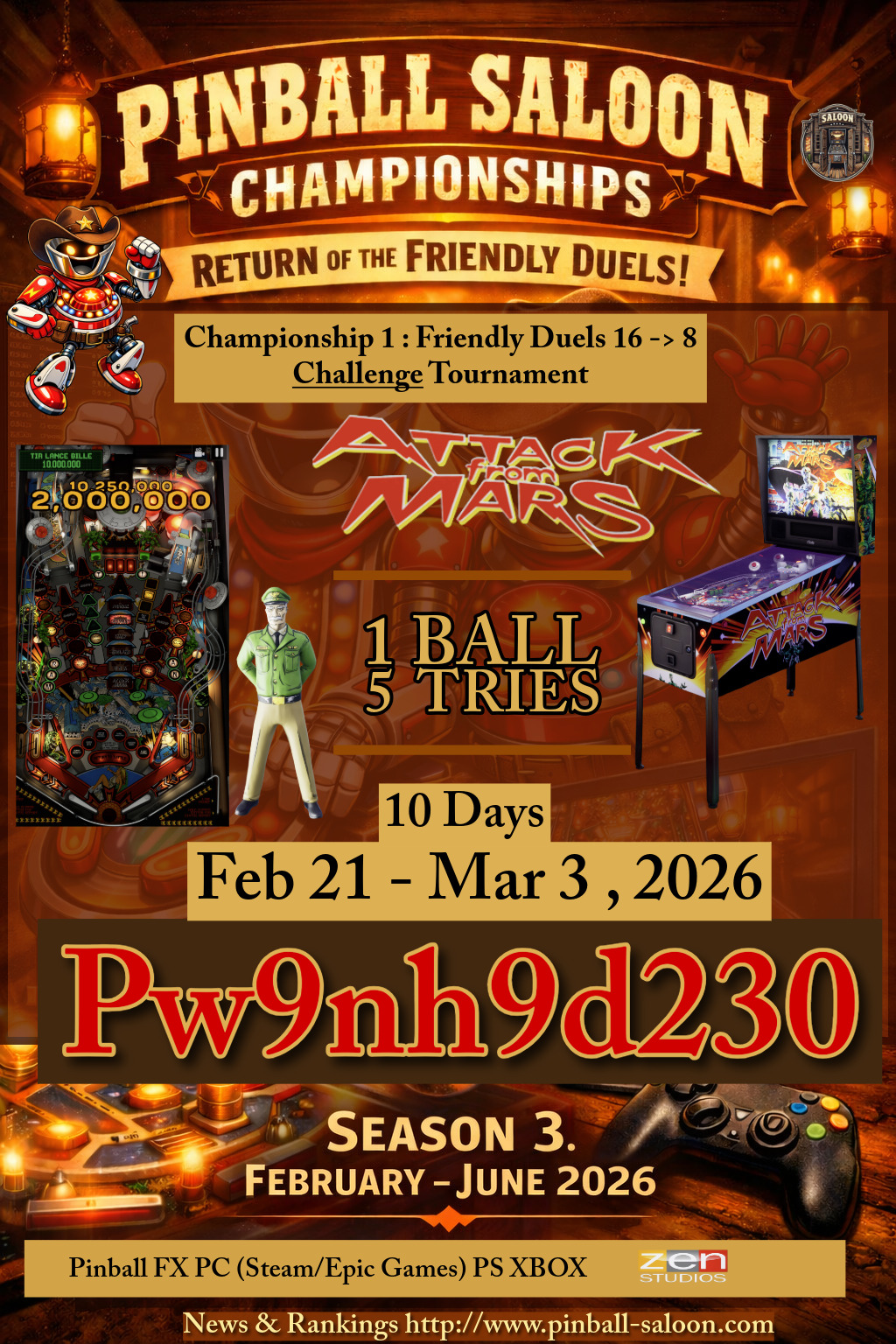 Classic TournamentID #Kb5tx0b30g Pinball FXTop 5Results Tournament and DivisionsRandom drawThe duellists' campsExtract from the general rankingWomen's rankingTeam's rankingPistoleros's rankingSeason 3 Return of the Friendly Duels Feb 2026 - Jun 2026TournamentsSaison...