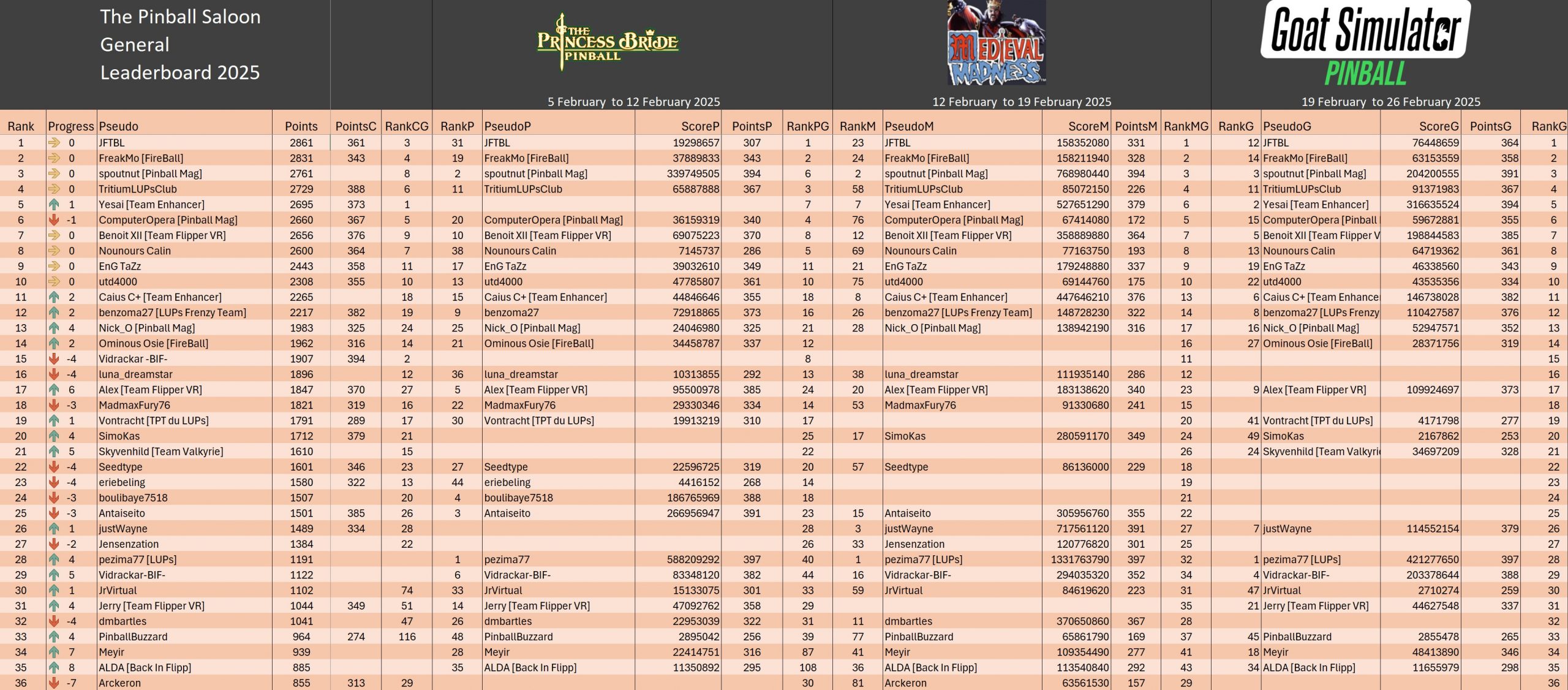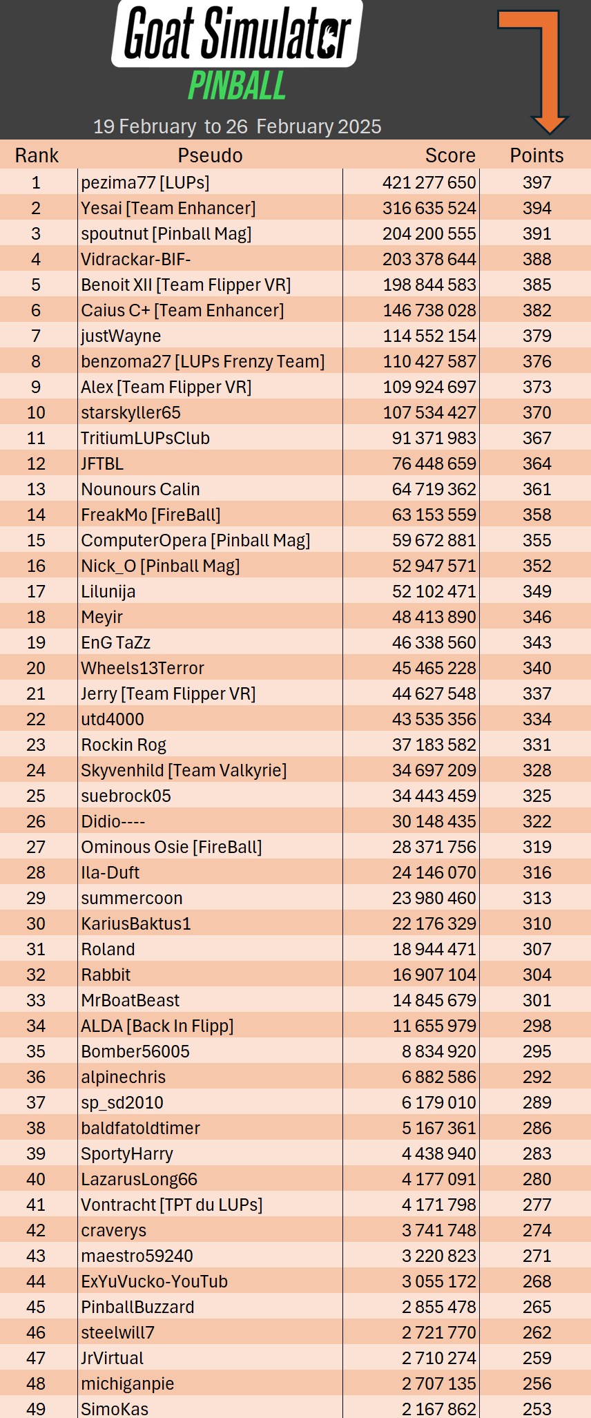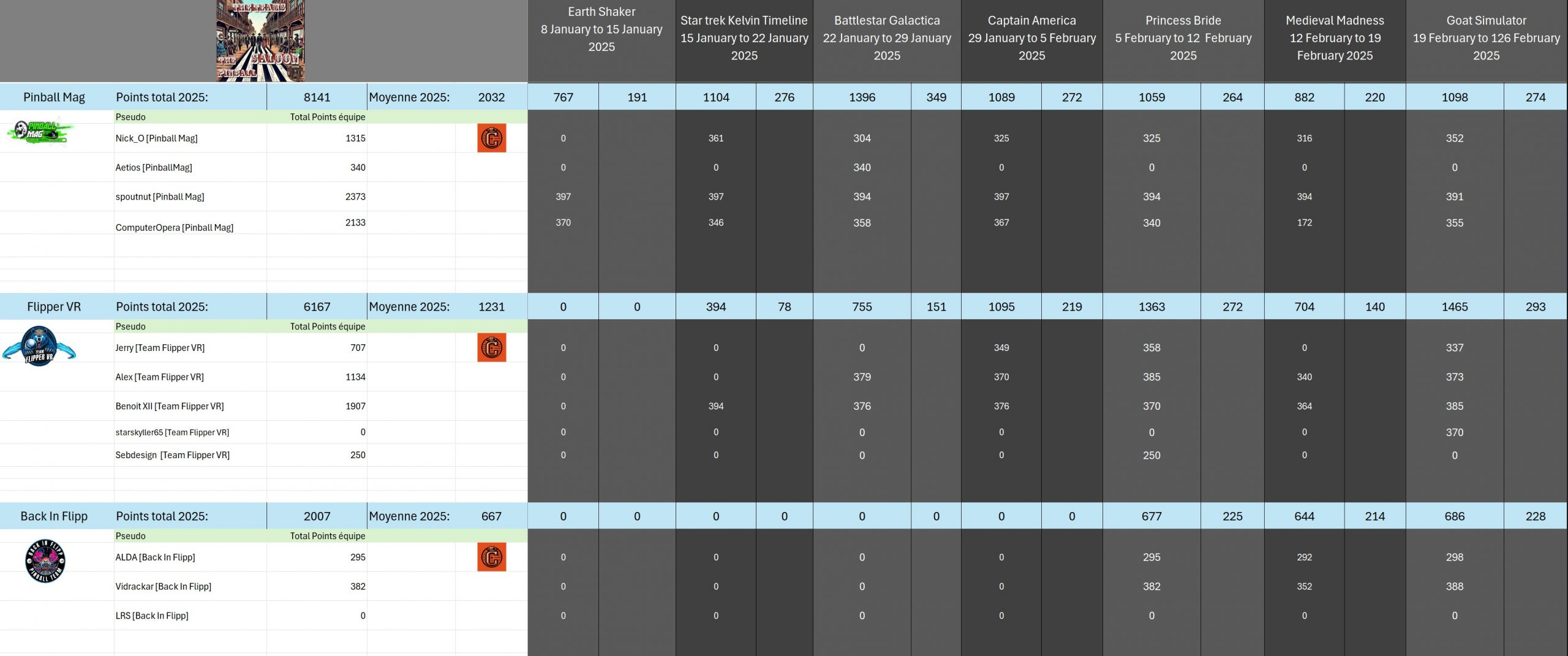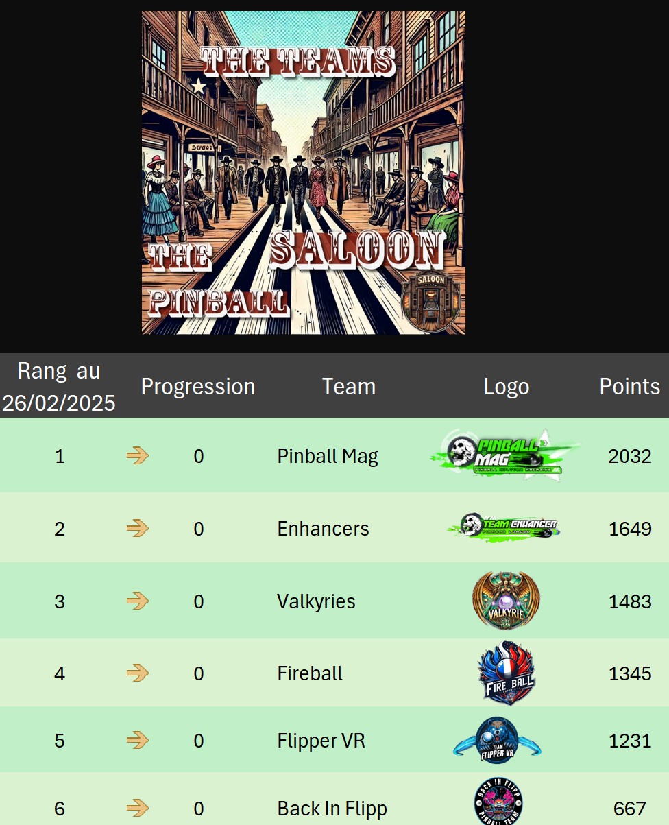 Classical TournamentResultsoverall team rankingPodiumResultsLeaderboardWomen's rankingTeam points detailsTrophiesTournements Season 1TournoisMusiqueFractalesA proposSoutienThe Pinball SaloonDiscordFacebookSite webBluesky The Pinball SaloonCommunautéNo Man's SkyMass...