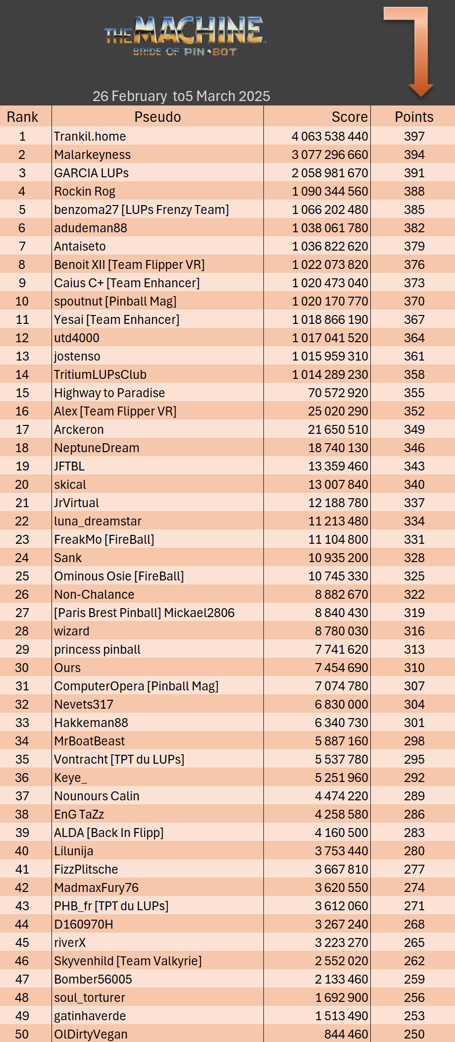 Classical TournamentResultsPodiumResultsoverall team rankingLeaderboardWomen's rankingTeam points detailsTrophiesTournements Season 1TournoisMusiqueFractalesA proposSoutienThe Pinball SaloonDiscordFacebookSite webBluesky The Pinball SaloonCommunautéNo Man's SkyMass...