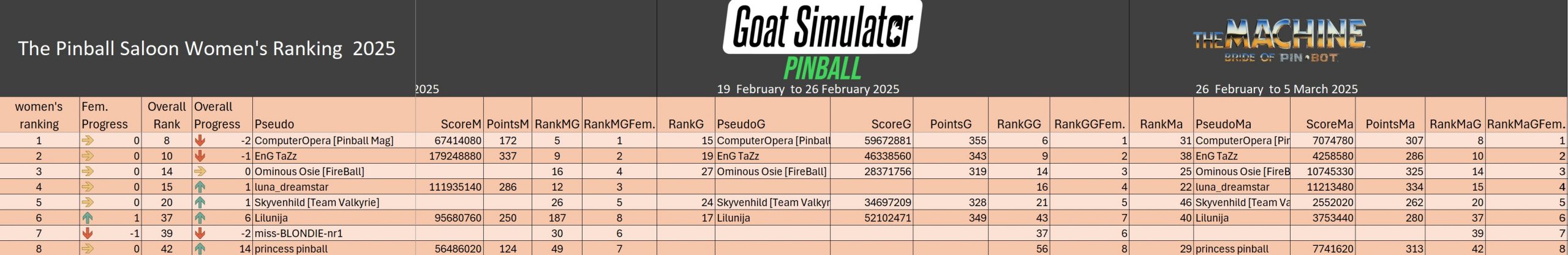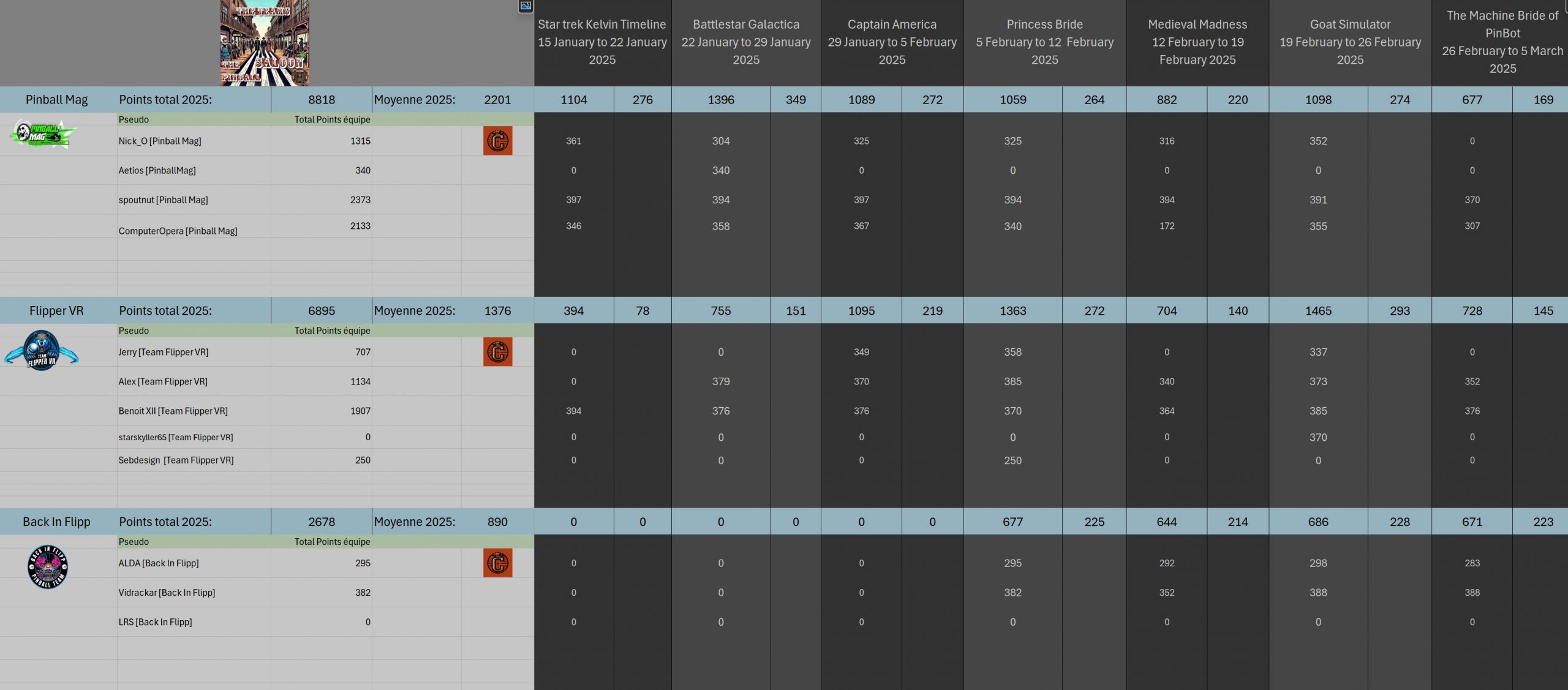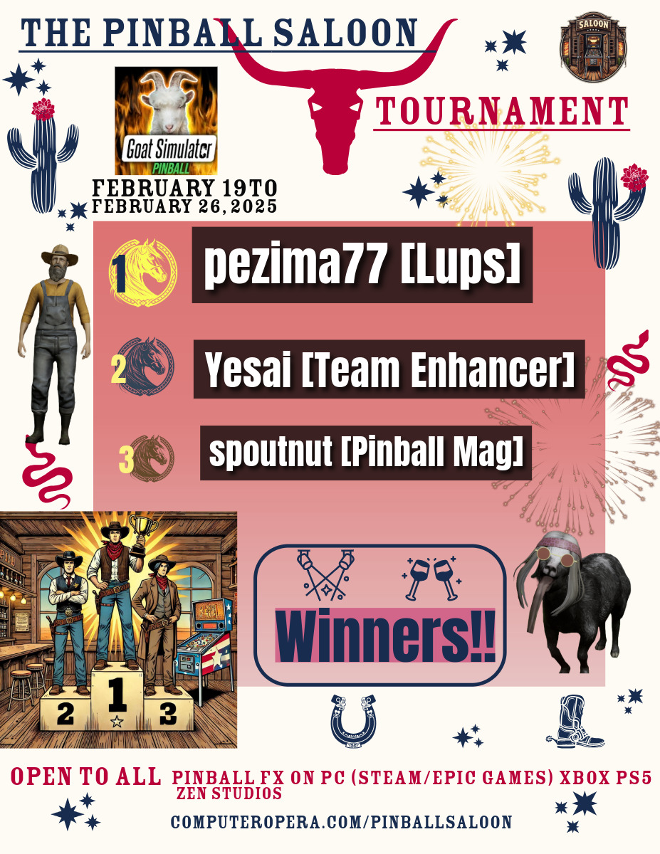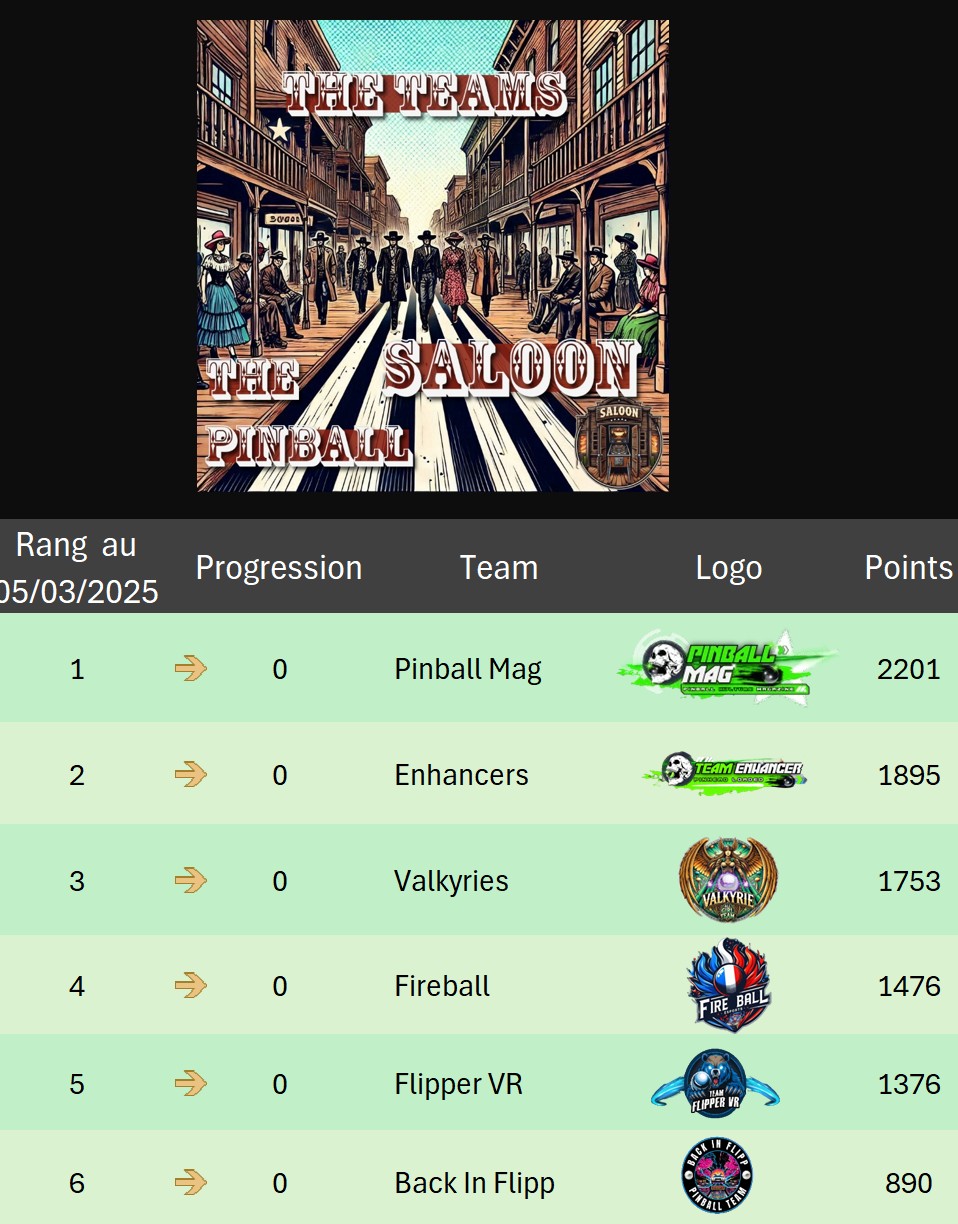 Classical TournamentResultsoverall team rankingPodiumResultsLeaderboardWomen's rankingTeam points detailsTrophiesTournements Season 1TournoisMusiqueFractalesA proposSoutienThe Pinball SaloonDiscordFacebookSite webBluesky The Pinball SaloonCommunautéNo Man's SkyMass...