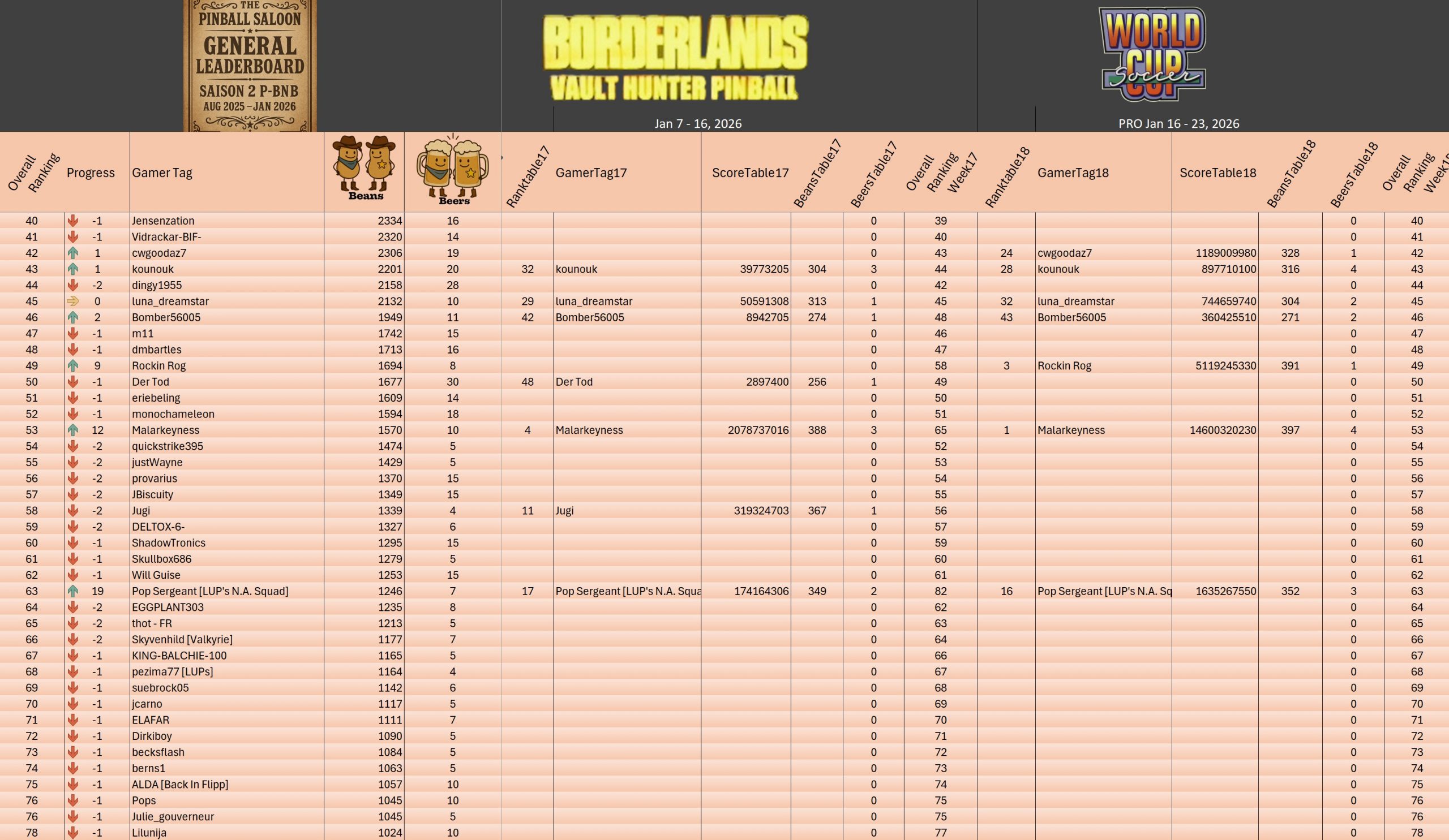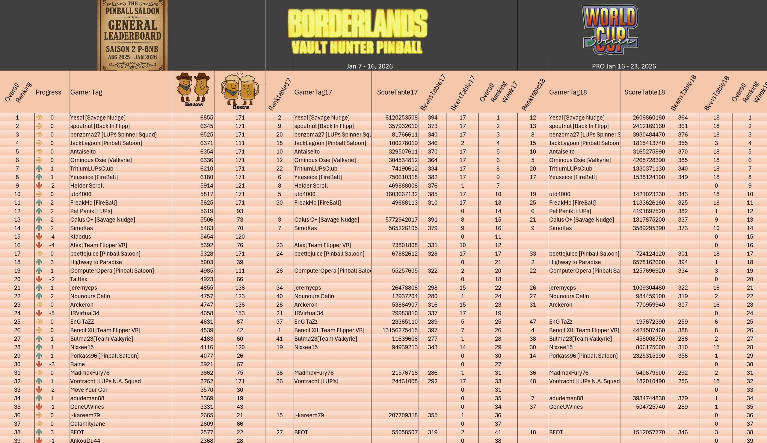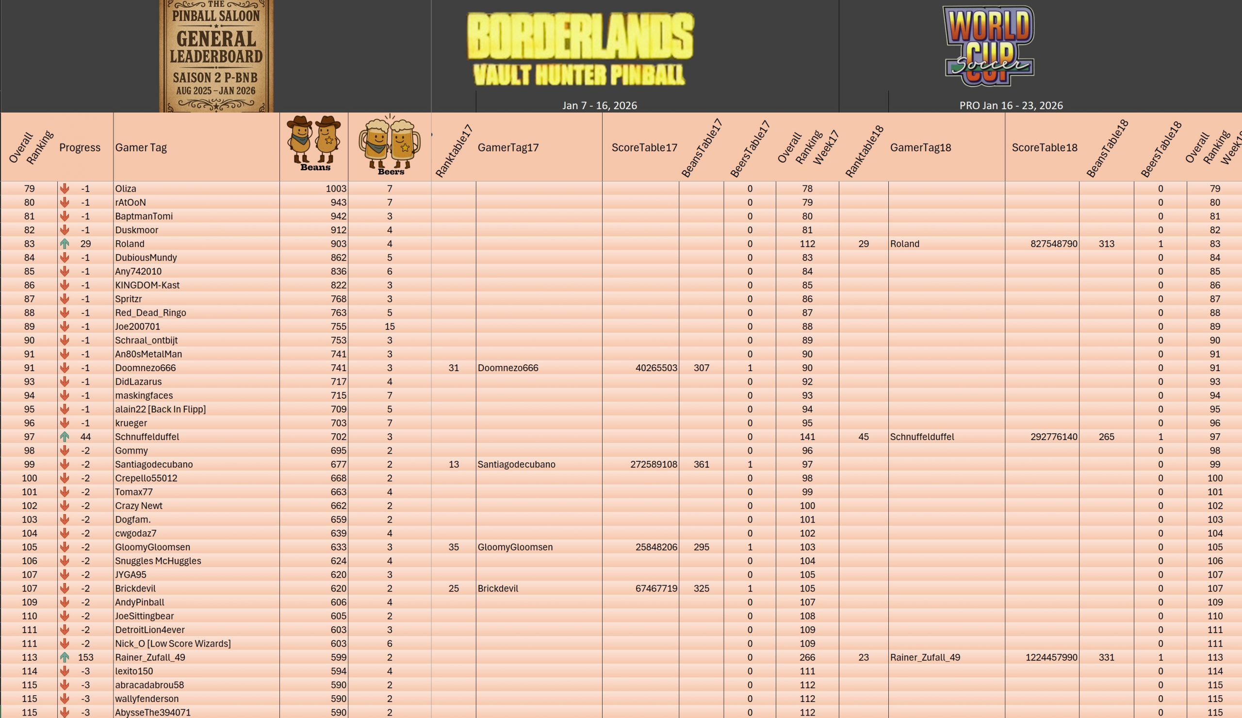 Classic TournamentID #Ddt6louyy3 Pinball FXTop 5Results Tournament Top 100 of 124 playersExtract from the general rankingWomen's rankingTeam's rankingPistoleros's rankingSeason 2 P-BnB Sept 2025 - Jan 2026TournamentsSaison 2Saison 1Saison 0LeaderboardsSaison 2Saison...