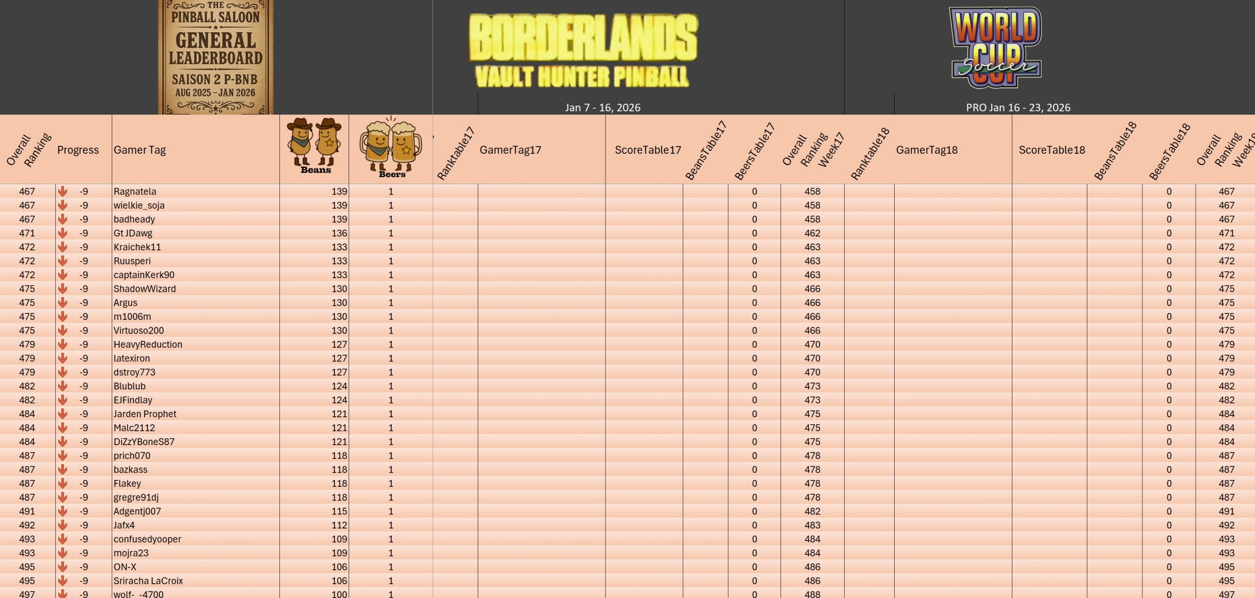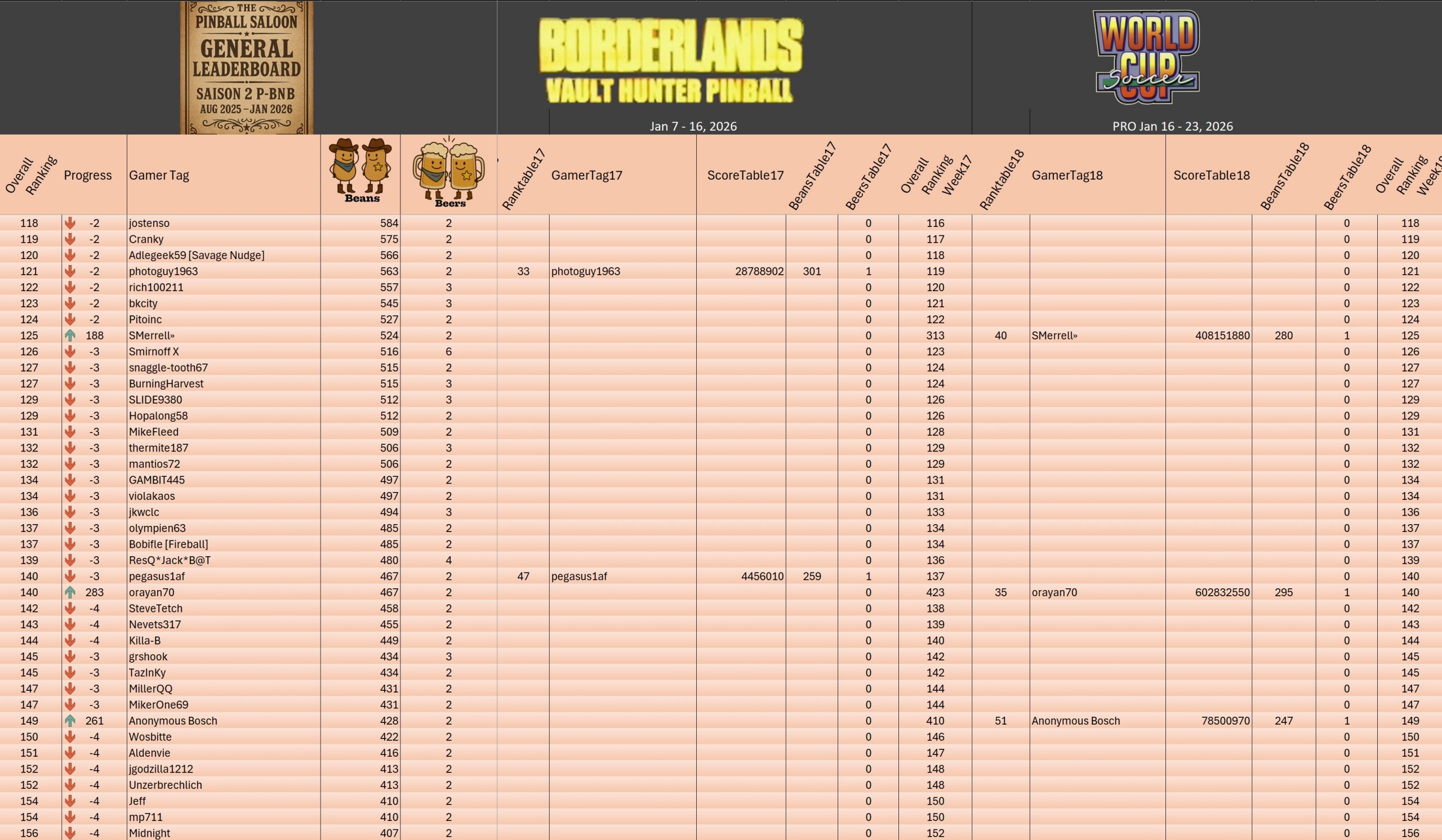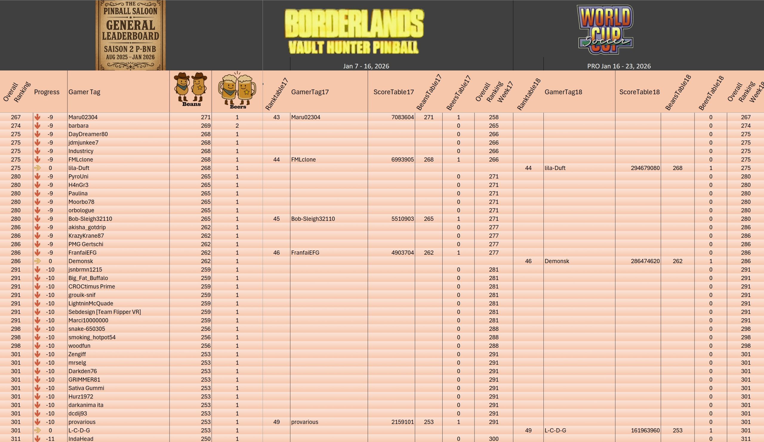 Classic TournamentID #Ddt6louyy3 Pinball FXTop 5Results Tournament Top 100 of 124 playersExtract from the general rankingWomen's rankingTeam's rankingPistoleros's rankingSeason 2 P-BnB Sept 2025 - Jan 2026TournamentsSaison 2Saison 1Saison 0LeaderboardsSaison 2Saison...