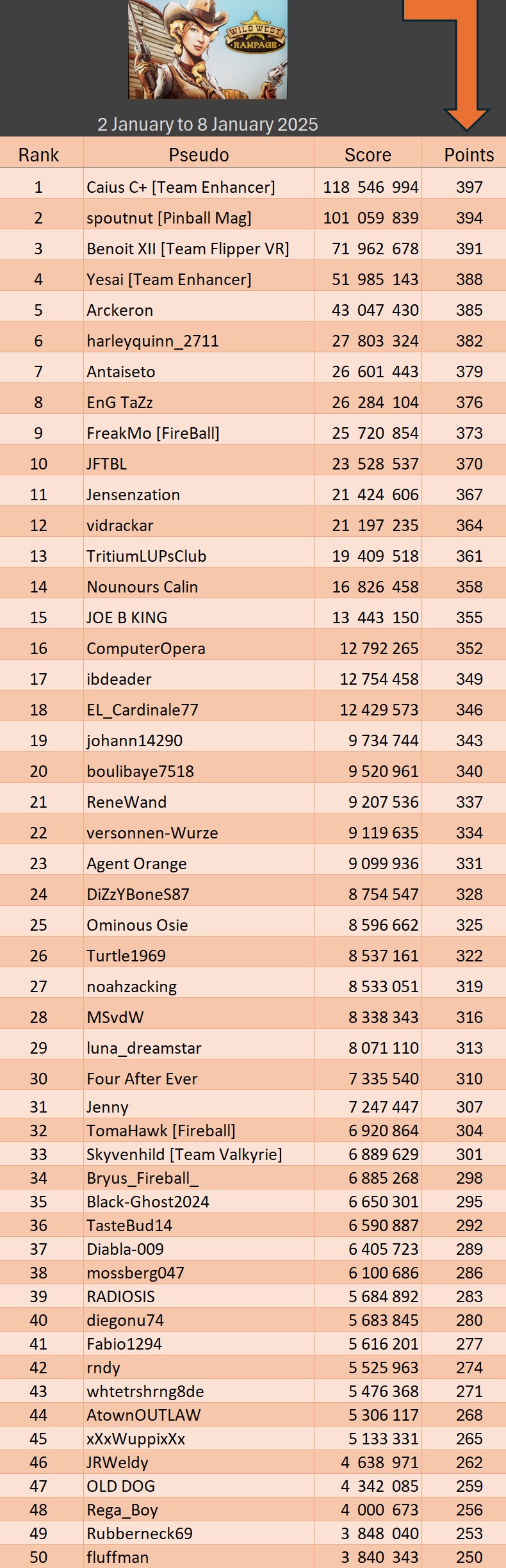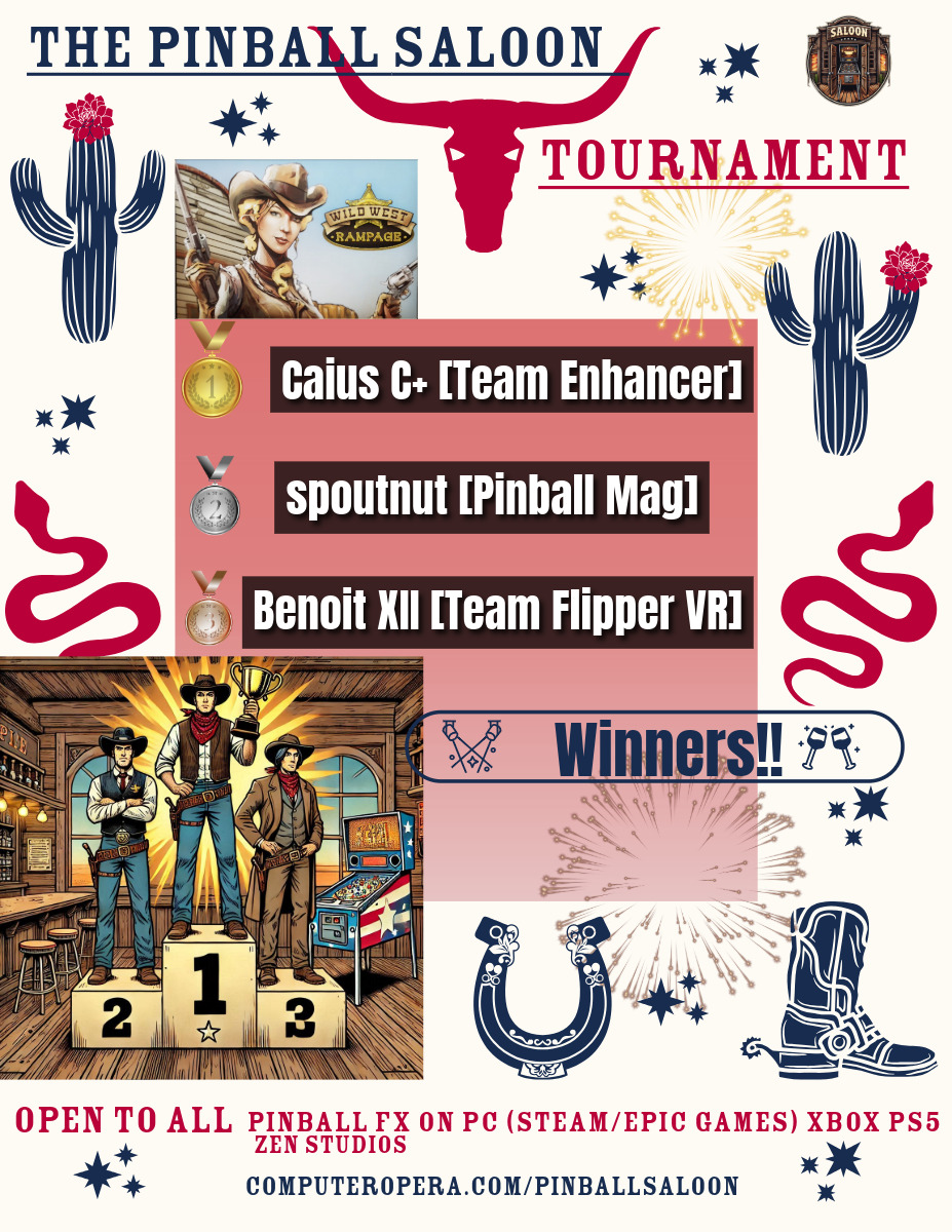 Classical TournamentResultsPodiumResultsoverall team rankingLeaderboardWomen's rankingTeam points detailsTrophiesTournements Season 1TournoisMusiqueFractalesA proposSoutienThe Pinball SaloonDiscordFacebookSite webBluesky The Pinball SaloonCommunautéNo Man's SkyMass...