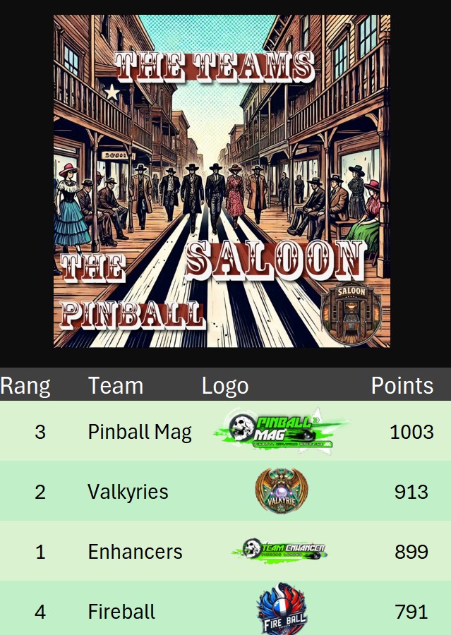 Classical TournamentResultsoverall team rankingPodiumResultsLeaderboardWomen's rankingTeam points detailsTrophiesTournements Season 1TournoisMusiqueFractalesA proposSoutienThe Pinball SaloonDiscordFacebookSite webBluesky The Pinball SaloonCommunautéNo Man's SkyMass...
