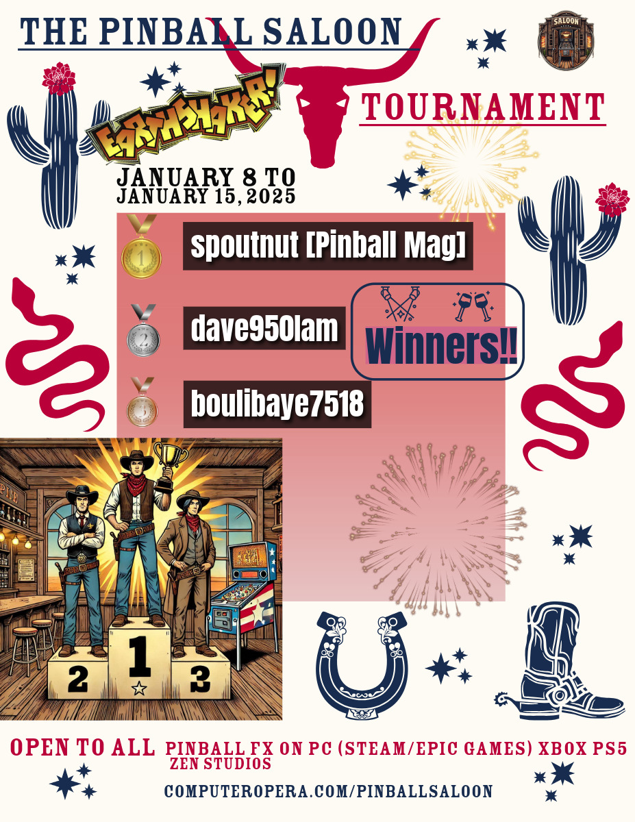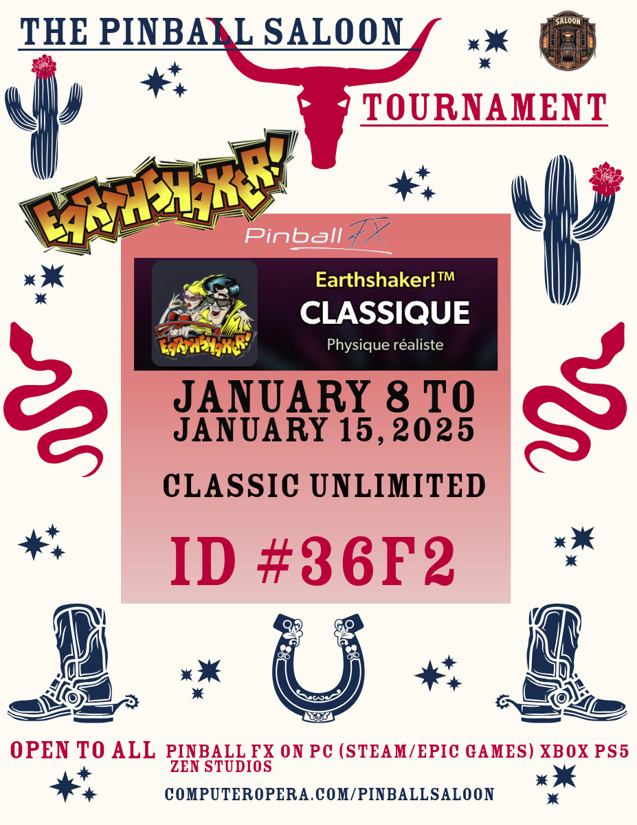 Classic TournamentResultsPodiumResultsTournements Season 1TournoisMusiqueFractalesA proposSoutienThe Pinball SaloonDiscordFacebookSite webBluesky The Pinball SaloonCommunautéNo Man's SkyMass Effect AndromedaStarfieldDiscord The Pinball SaloonFacebook The Pinball...