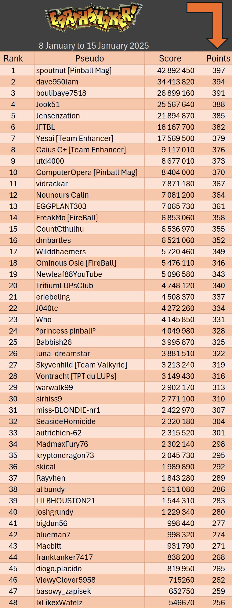 Mode Pro TournamentResultsoverall team rankingPodiumResultsLeaderboardWomen's rankingTeam points detailsTrophiesTournements Season 1TournoisMusiqueFractalesA proposSoutienThe Pinball SaloonDiscordFacebookSite webBluesky The Pinball SaloonCommunautéNo Man's SkyMass...