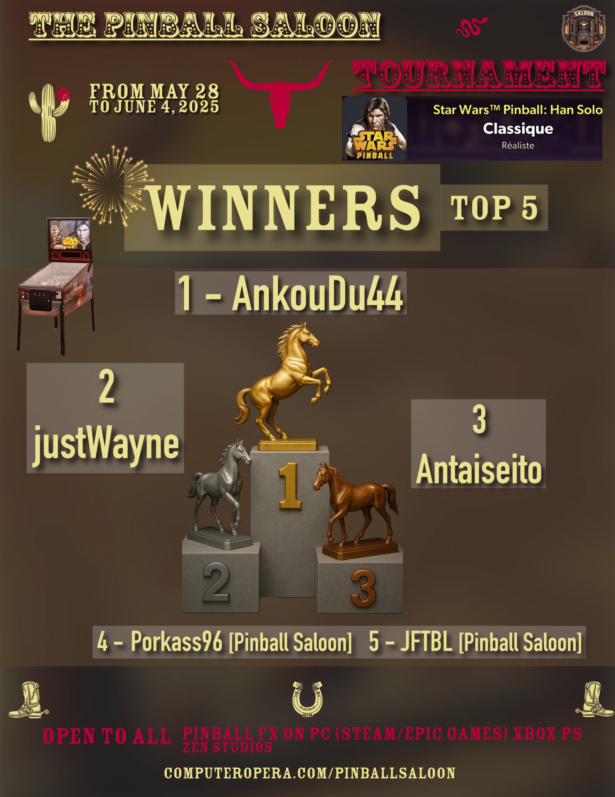 Classic TournamentResultsPodiumResultsTournements Season 1TournoisMusiqueFractalesA proposSoutienThe Pinball SaloonDiscordFacebookSite webBluesky The Pinball SaloonCommunautéNo Man's SkyMass Effect AndromedaStarfieldDiscord The Pinball SaloonFacebook The Pinball...