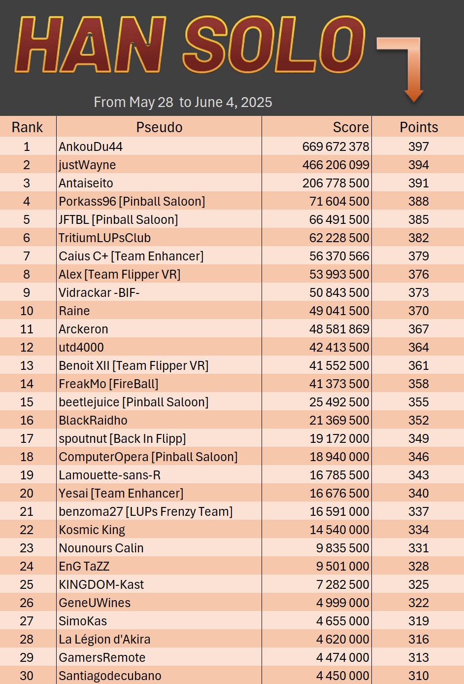 Classical TournamentResultsoverall team rankingPodiumResultsLeaderboardWomen's rankingTeam points detailsTournements Season 1TournoisMusiqueFractalesA proposSoutienThe Pinball SaloonDiscordFacebookSite webBluesky The Pinball SaloonCommunautéNo Man's SkyMass Effect...